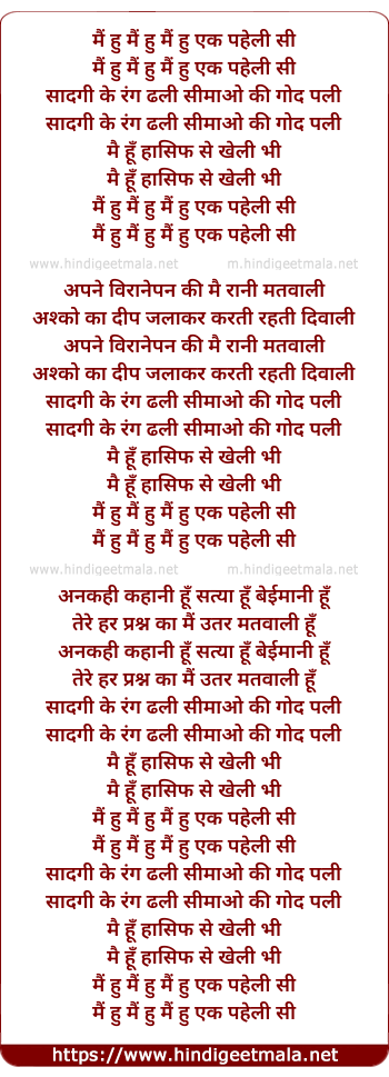 Lyrics of Mai Hu Ek Paheli Si (Paheli) - मैं हु मैं हु मैं हु एक पहेली सी