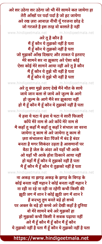 Lyrics of Mai Hu Kaun Ye Tujhko Nahi Hai Pata - मैं हूँ कौन ये तुझको नहीं है पता