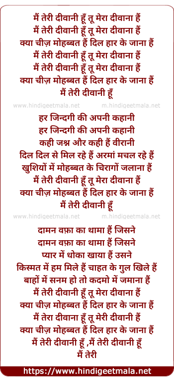 Lyrics of Mai Teri Diwani Hu Tu Mera Diwana Hai - मैं तेरी दीवानी हूँ तू मेरा दीवाना हैं