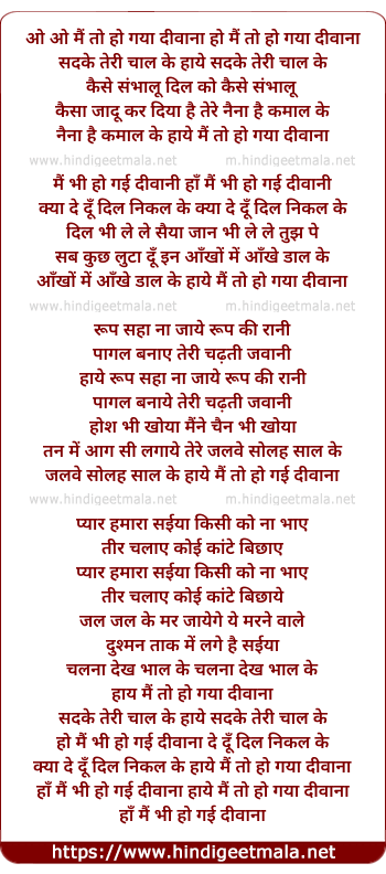 Lyrics of Mai To Ho Gaya Diwana - मैं तो हो गया दीवाना