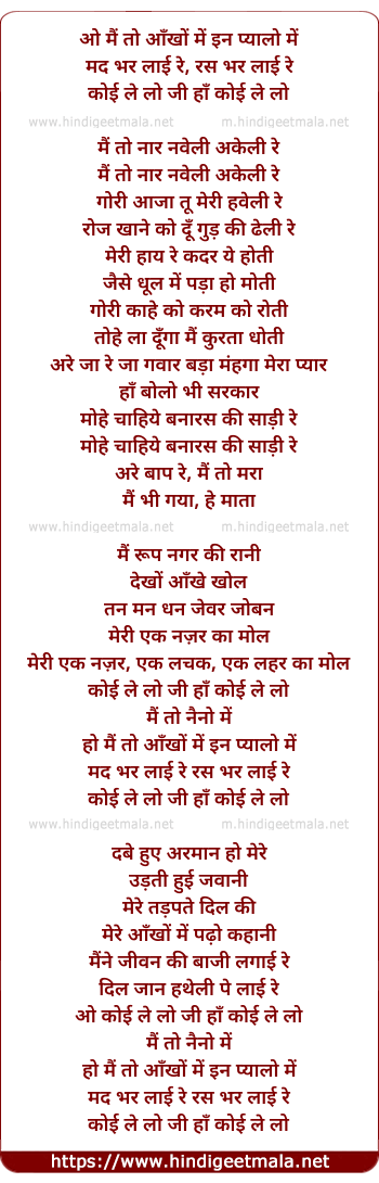 Lyrics of Mai To Naino Me, Mad Bhar Laai Re - मैं तो नैनों में, मद भर लाई रे