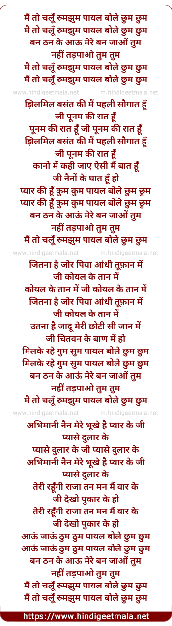 Lyrics of Mai To Chalu Rumjhoom Payal Bole Chhum Chhum - मैं तो चलूँ रुमझुम पायल बोले छुम छुम