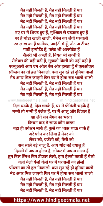 Lyrics of Maid Nahi Milti Hai Yaar - मैड नहीं मिलती हैं, मैड नहीं मिलती हैं यार