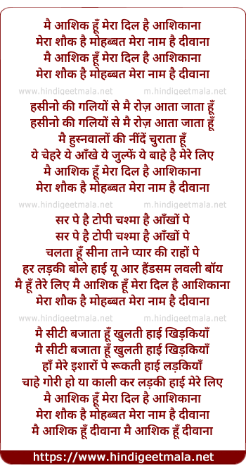 Lyrics of Main Aashiq Hoon, Mera Dil Hai Aashiqaana - मै आशिक हूँ ,मेरा दिल है आशिकाना