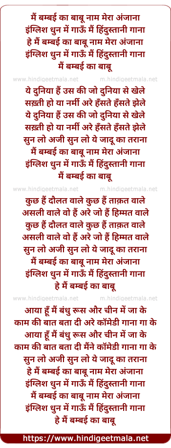 Lyrics of Main Bambai Ka Babu Naam Mera Anjana - मैं बम्बई का बाबू नाम मेरा अंजाना