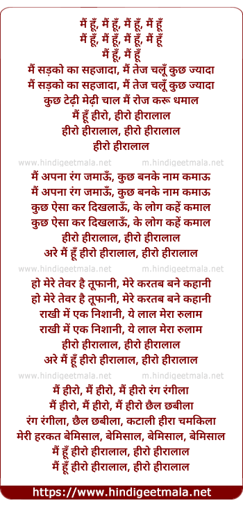 Lyrics of Main Hoon Hero Hero Hiraalaal - मैं हूँ हीरो हीरो हीरालाल
