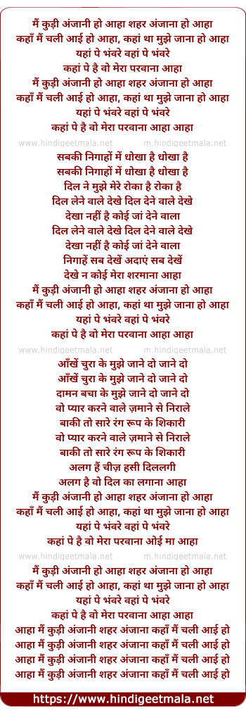 Lyrics of Main Kudi Anjani Hu Aha Sahar Anjana Ho Aha - मैं कुड़ी अंजानी हूँ आहा शहर अंजाना हो आहा