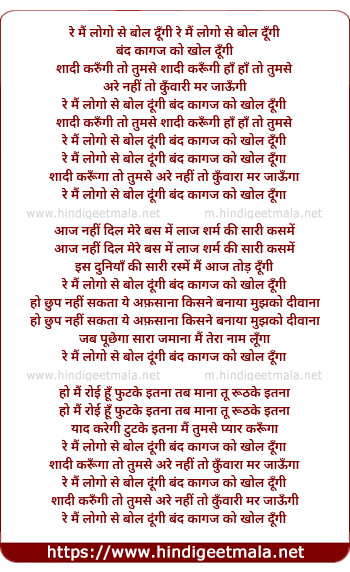 Lyrics of Main Logo Se Bol Dungi - मैं लोगो से बोल दूँगी
