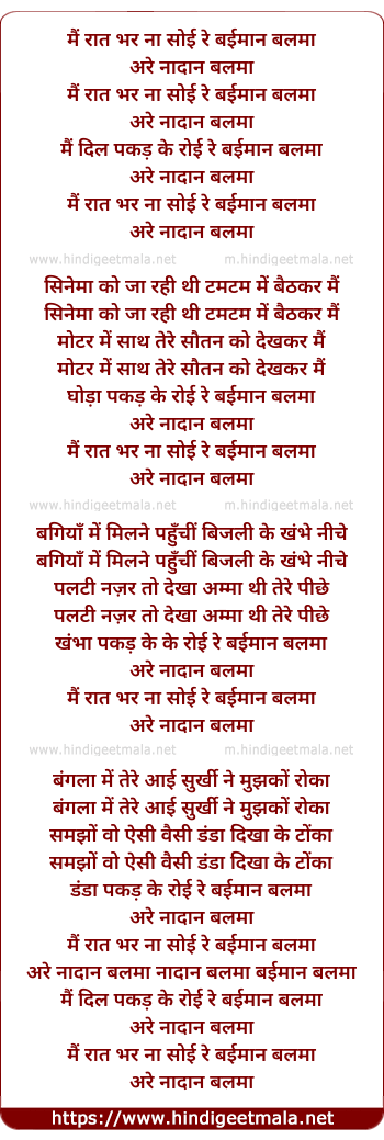 Lyrics of Main Rat Bhar Na Soyi Re Baiman Balma - मैं रात भर ना सोई रे बईमान बलमा