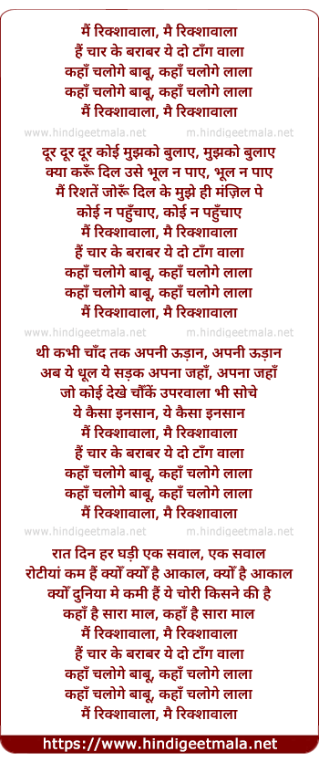 Lyrics of Main Rikhsha Wala, Main Riksha Wala - मैं रिक्शा वाला, मै रिक्शा वाला