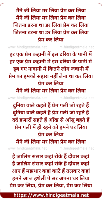 Lyrics of Maine Jee Liya Mar Liya Prem Kar Liya - मैने जी लिया मर लिया प्रेम कर लिया