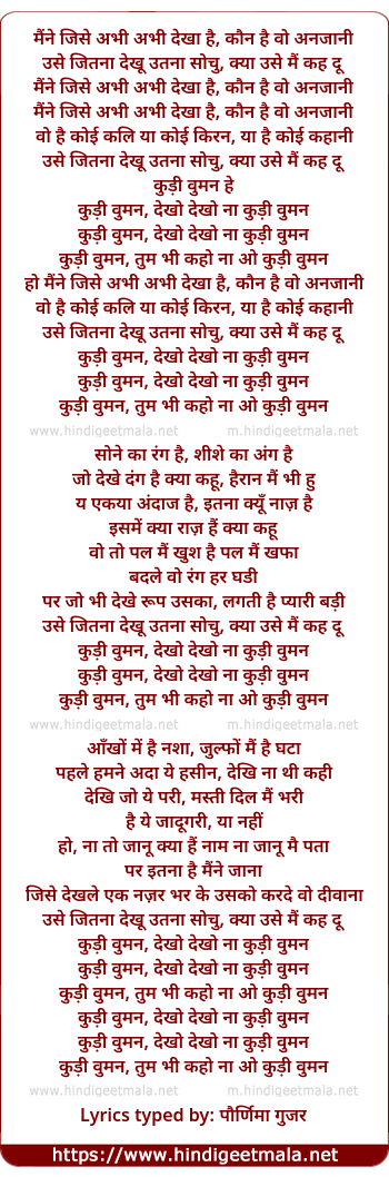 Lyrics of Maine Jise Abhi Abhi Dekha Hai - मैंने जिसे अभी अभी देखा है, कौन है वो अनजानी