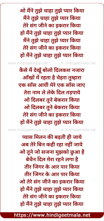 Lyrics of Maine Tujhe Chaha Tujhe Pyar Kiya - मैंने तुझे चाहा तुझे प्यार किया