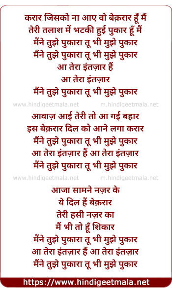 Lyrics of Maine Tujhe Pukara Tu Bhi Mujhe Pukar - मैंने तुझे पुकारा तू भी मुझे पुकार