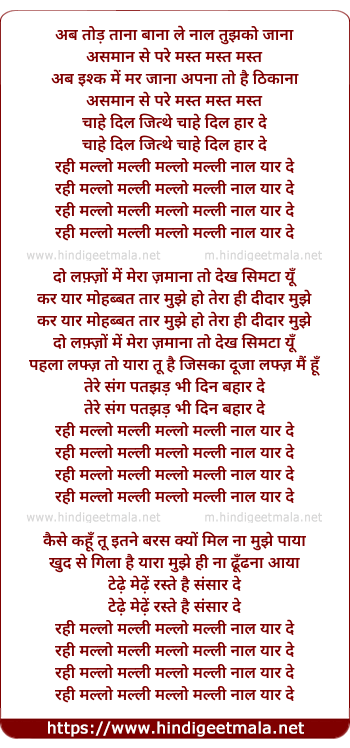 Lyrics of Rahi Mallo Malli Mallo Malli Naal Yaar De - रही मल्लो मल्ली मल्लो मल्ली नाल यार दे