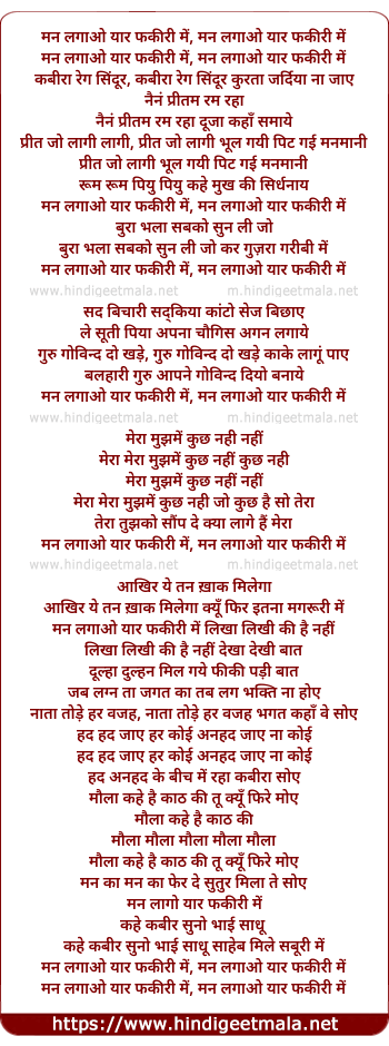 Lyrics of Man Lagao Yar Fakiri Me - मन लगाओ यार फकीरी में