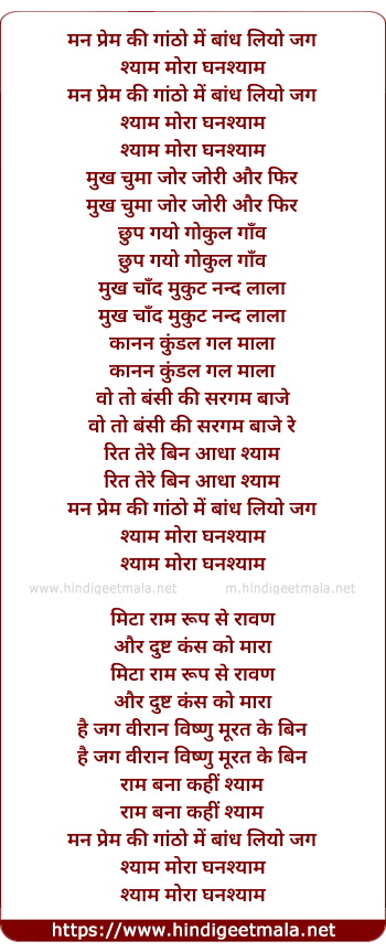 Lyrics of Man Prem Ki Gantho Me Bandh Liyo Jaat - मन प्रेम की गांठो में बांध लियो जग