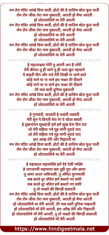 Lyrics of Man Tera Mandir Aankhe Diya Baati - मन तेरा मंदिर आंखे दिया बाती