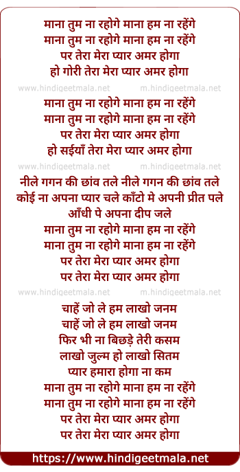 Lyrics of Mana Tum Na Rahoge Mana Hum Na Rahenge - माना तुम ना रहोगे माना हम ना रहेंगे