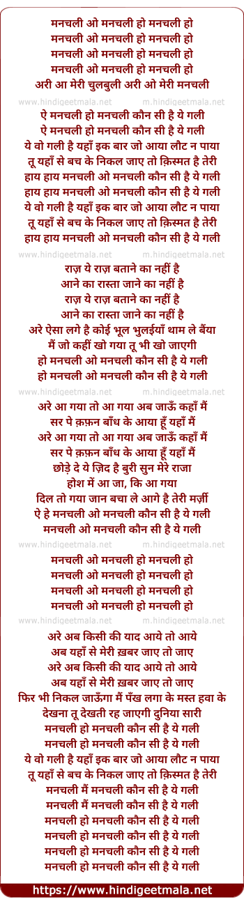 Lyrics of Manchali O Manchali Ho Manchali Ho - मनचली ओ मनचली हो मनचली हो