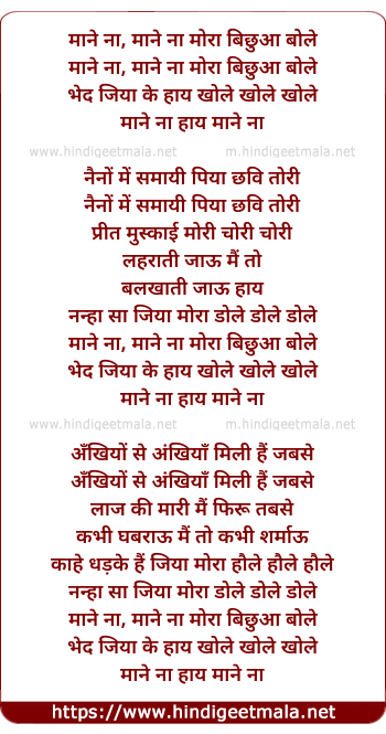 Lyrics of Mane Na Mora Bichhua Bole - माने ना, माने ना मोरा बिछुआ बोले