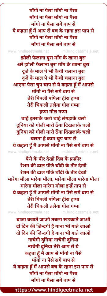 Lyrics of Mango Na Paisa Saghe Baap Se - माँगो ना पैसा सगे बाप से