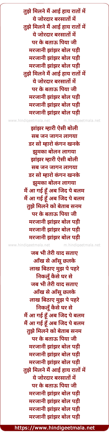 Lyrics of Mar Jaani Jhaanjar Bol Padi - तुझे मिलने मैं आई हाय रातों में