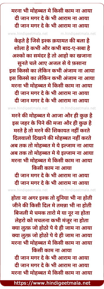 Lyrics of Maranaa Bhi Mohabbat Men Kisi Kaam Na Aayaa - मरना भी मोहब्बत मे किसी काम ना आया