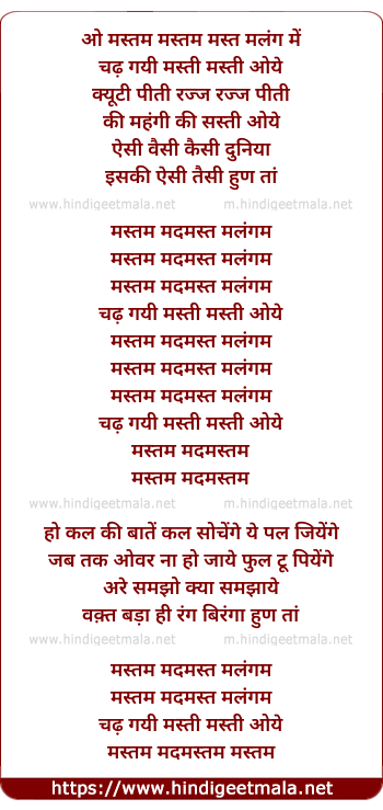 Lyrics of Mastam Mastam - मस्तम मस्तम