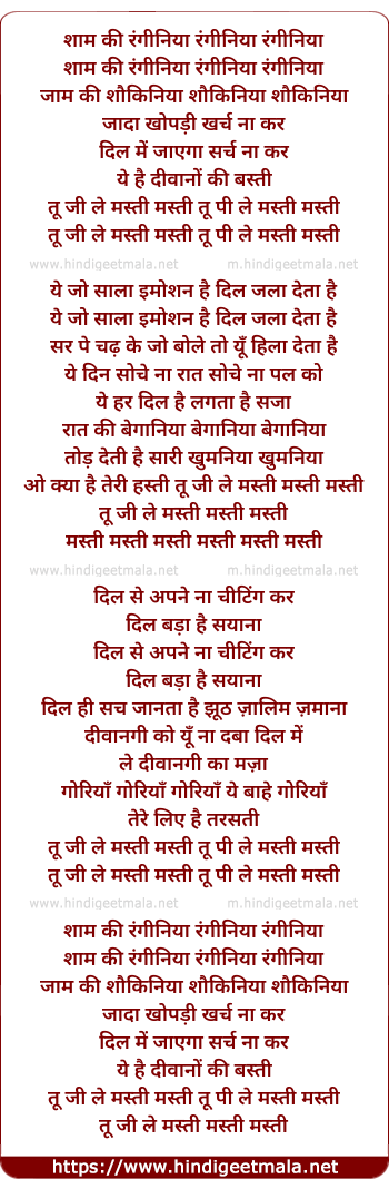 Lyrics of Masti Masti Masti (Shadow) - शाम की रंगीनिया रंगीनिया रंगीनिया