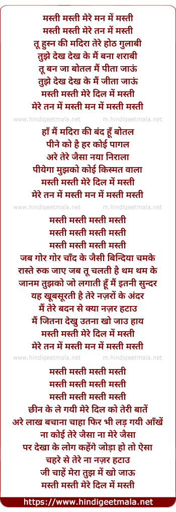 Lyrics of Masti Masti Mere Man Me - मस्ती मस्ती मेरे मन में
