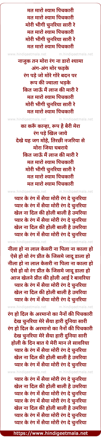 Lyrics of Mat Maro Shyam Pichkari - मत मारो श्याम पिचकारी