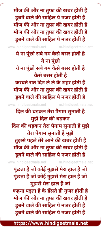 Lyrics of Mauj Ki Aur Na Toofan Ki Khabar - मौज की और ना तुफ़ा की खबर