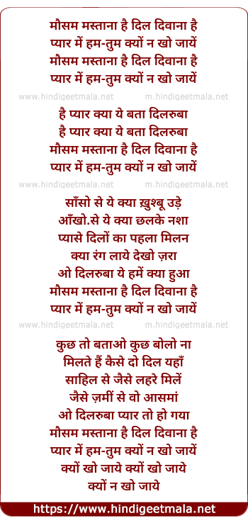 Lyrics of Mausam Mastana Hai Dil Deewana Hai - मौसम मस्ताना है दिल दिवाना है