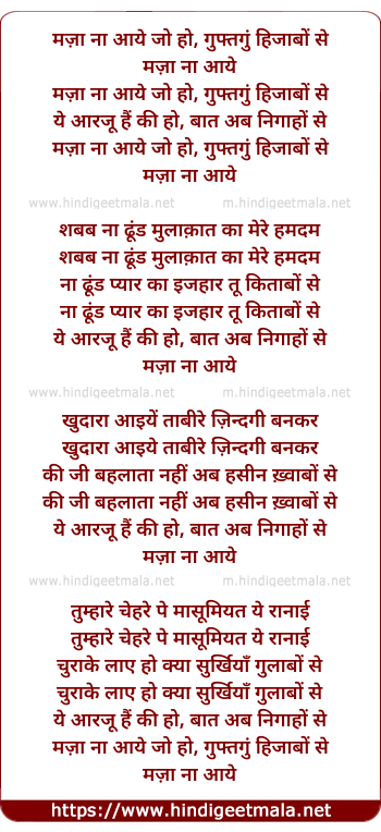 Lyrics of Maza Na Aaye - मज़ा ना आये जो हो, गुफ्तगुं हिजाबों से