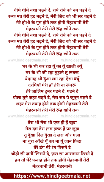 Lyrics of Meharbani Teri - धीमे धीमे नशा चढ़ने दे, रोये रोये को नम पड़ने दे