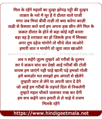 Lyrics of Mehlo Ka Dulha - मिल के रहेंगे महलों का दुल्हा झोपड़ पट्टी की दुल्हन