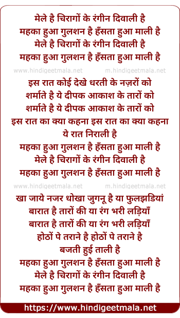 Lyrics of Mele Hain Chiraago Ke, Rangin Diwali Hai, Mahka Hua Gulshan Hai - मेले है चिरागों के रंगीन दिवाली है