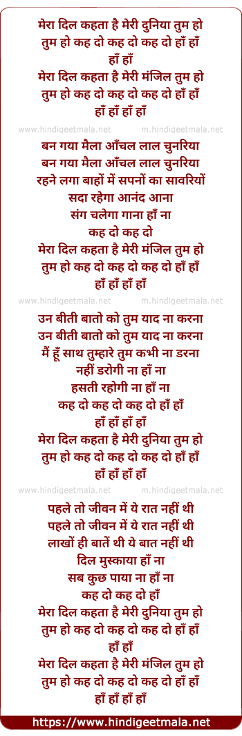 Lyrics of Mera Dil Kahta Hai Meri Duniya Tum Ho - मेरा दिल कहता है मेरी दुनिया तुम हो
