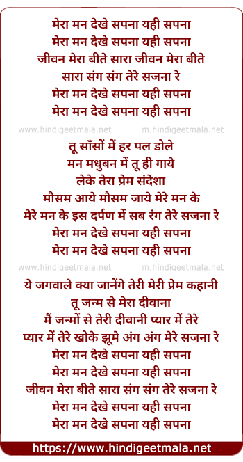 Lyrics of Mera Mann Dekhe Sapna Yahi Sapna - मेरा मन देखे सपना यही सपना