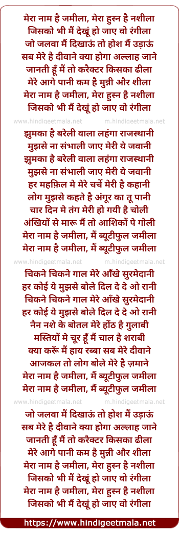Lyrics of Mera Naam Hai Jameela - मेरा नाम है जमीला