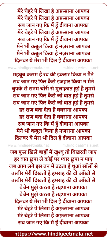 Lyrics of Mere Chehare Pe Likha Hai Afsaana Aap Kaa - मेरे चेहरे पे लिखा है अफ़साना आप का
