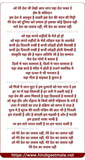 Lyrics of Mere Desh Ka Jawab Nahi - मेरे देश का जबाब नहीं