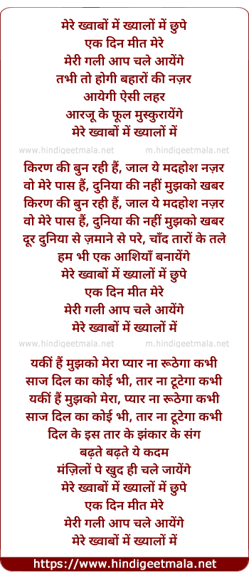 Lyrics of Mere Khwabo Ke Khayalo Me (Female) - मेरे ख्वाबों के ख्यालों में