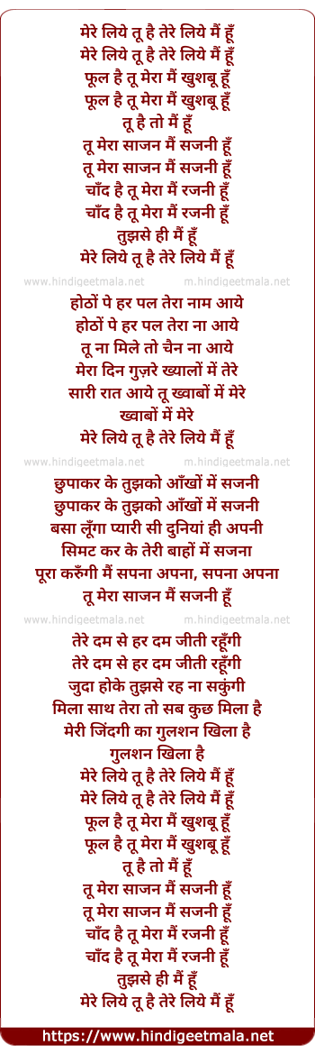 Lyrics of Mere Liye Tu Hai - मेरे लिये तू है