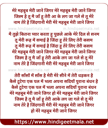 Lyrics of Mere Mehboob Meri Jaane Jigar - मेरे महबूब मेरी जाने जिगर
