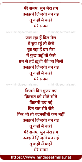 Lyrics of Mere Sanam Sun Mera Gham, Uljhane Zindagi Ban Gayi Tu Kahi Mai Kahi (Female) - मेरे सनम सुन मेरा ग़म,उलझनें ज़िन्दगी बन गई तू कहीं मैं कहीं