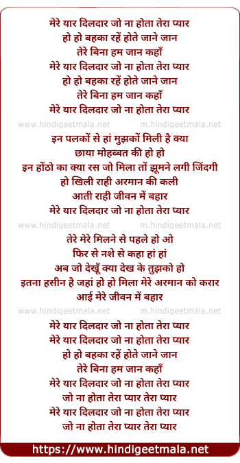 Lyrics of Mere Yaar Dildaar, Jo Na Hota Tera Pyaar - मेरे यार दिलदार जो ना होता तेरा प्यार