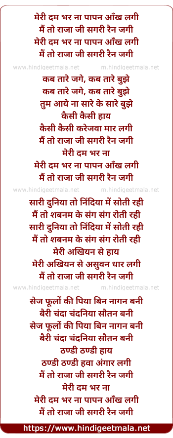 Lyrics of Meri Dam Bhar Na Papan Ankh Lagi - मेरी दम भर ना पापन आँख लगी