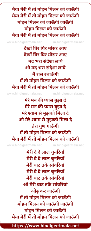 Lyrics of Meri Main To Mohan Milan Ko Jaungi - मेरी मैं तो मोहन मिलन को जाऊँगी